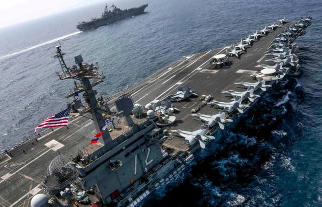 目前,美军“林肯”号、“福特”号、“布什”号三艘核动力航母即将部署到位,其中“林肯”号直接卡在霍尔木兹海峡外海。加上中东地区约5万美军,月底前还要增兵1万,这三航母6万人的阵仗确实吓人。