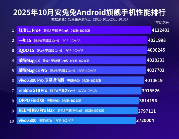 今天分享的是2025年10月份安兔兔旗舰手机性能榜:随着旗舰新机的发布,9月份的冠军小米17Pro Max跌出前十,第一名意料之中,因为它的名字叫红魔11 Pro+。从芯片来看的话,骁龙8EliteGen5依旧更胜一筹,拿下了安卓旗舰性能榜的前五名。
