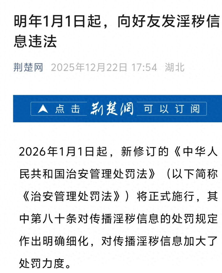 一则#夫妻或情侣互发私密照违法吗#的热搜,像一块巨石投入平静的湖面,激起了舆论的千层浪。2026年1月1日,新修订的《治安管理处罚法》即将施行,其中对传播淫秽信息行为的明确与严惩,让无数曾以为“私聊即安全”的网友心头一紧。在亲密关系的私密花园里,那些自愿、私密的情趣互动,是否就此被法律的无形之手笼罩?我们一边为净化网络环境鼓掌,一边又不免暗自思量:这柄意在斩断黑色产业链的利剑,会否在不经意间,划伤普通人亲密关系中那方自愿、私密的角落?